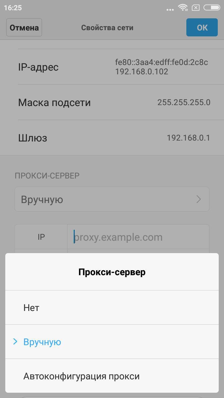Далее выбираем опцию «Вручную». После этого вписываем параметры полученные на сайте в HTTP Proxy (IP и Port), а затем нажимаем ОК.