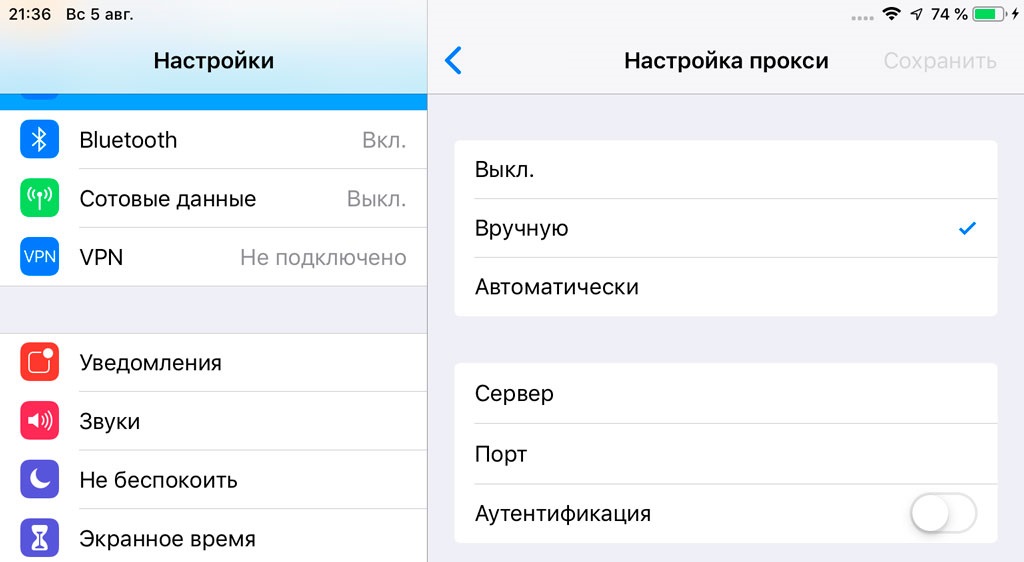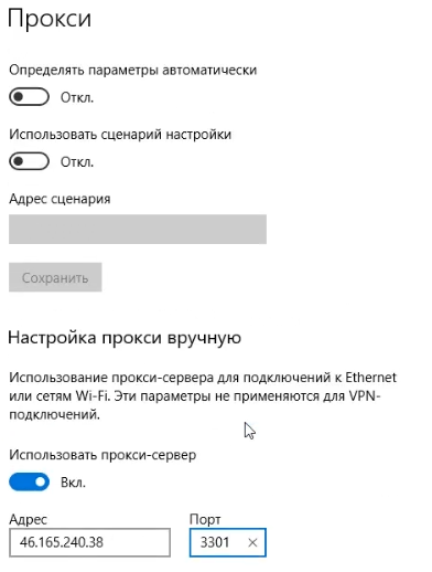 В открывшемся окне отключите опцию «Определять параметры автоматически», если она была включена. Затем включите опцию использования прокси сервера и пропишите полученные настройки в HTTP Proxy (IP и Port), после нажмите «Сохранить».